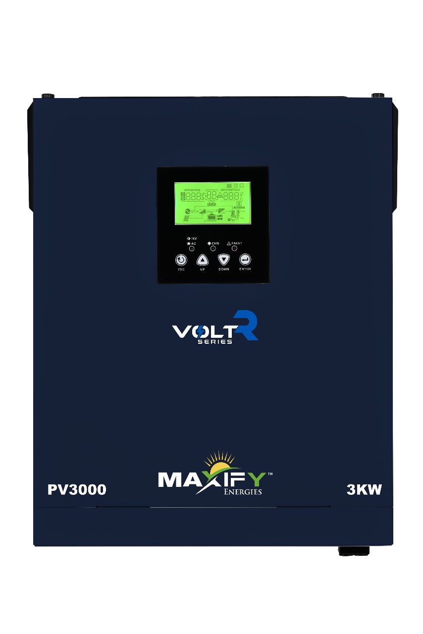 Maxify Energies 3kW Pv3000 (volt R series) IP21 Hybrid Solar Inverter is a high-capacity hybrid solution designed for homes, offices, and businesses with larger energy needs. With its powerful 3000W output and advanced MPPT technology, it ensures maximum solar energy utilization, smooth performance, and long-lasting durability.
