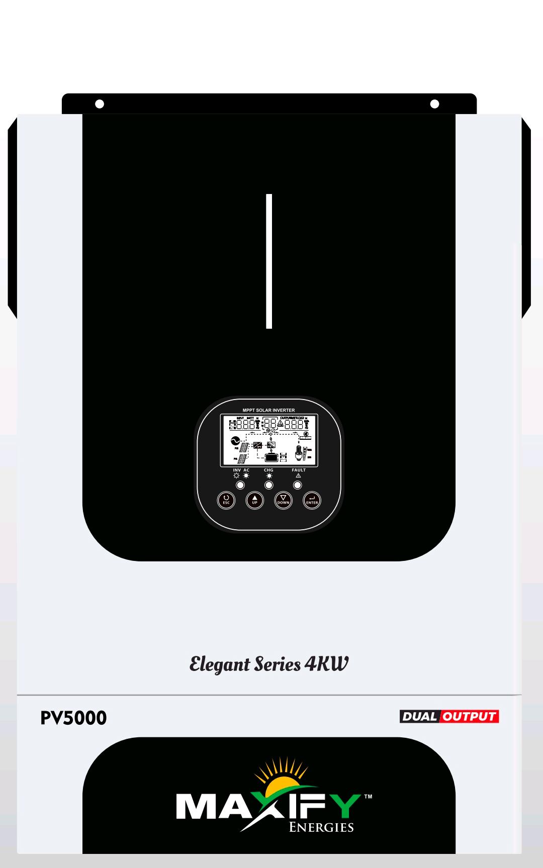Maxify Energies 4kW Pv5000 (Elegant Series) IP21 Hybrid Solar Inverter is a high-capacity hybrid solution designed for homes, offices, and businesses with larger energy needs. With its powerful 4000W output and advanced MPPT technology, it ensures maximum solar energy utilization, smooth performance, and long-lasting durability.